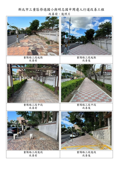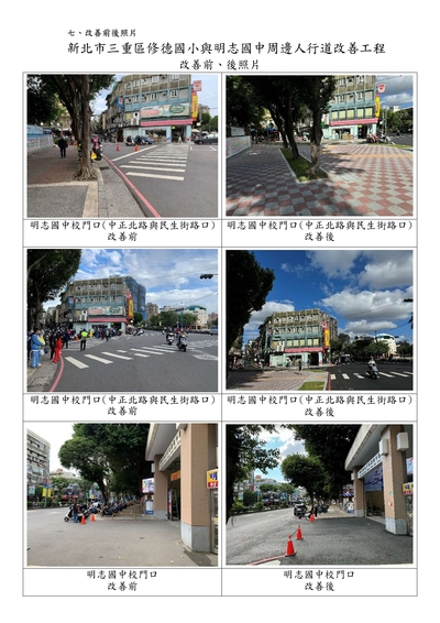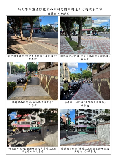 四、改善範圍及成果:1.改善修德國小與明志國中學校周邊中正北路、重陽路三段、重陽路三段五巷、民生街延伸至市前街(單側人行道、停車及照明等設施),改善總長度1084公尺。
